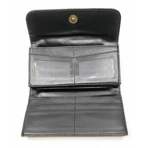The inside has 1 zippered section, 2 clear plastic section for IDs, 3 long sections for