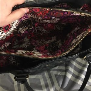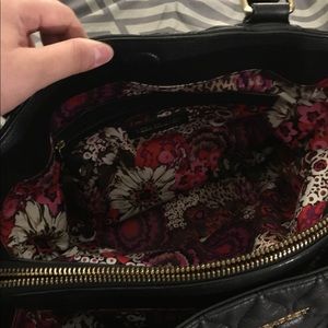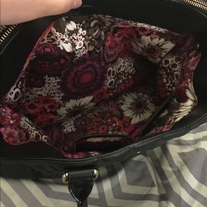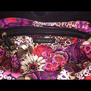 This is a used Vera Bradley tote in excellent condition! Ample storage space with three separate pockets. The middle is a zipper closure and the outer two are with a magnet. Also has two small pockets in the front closure and a small zipper pocket in the inside at the back.