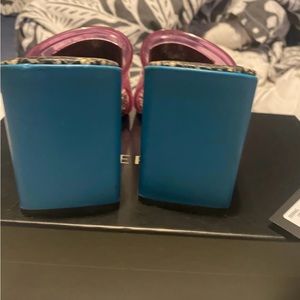 These Versace 70 PVC Snake Sandals are a size 38 and feature a unique combination of multicolor leather and vinyl/PVC. They are designed with a slip-on style and feature a rubber front logo plaque, snakeskin panels, an open square toe, and a block heel. Despite being gently used and worn only twice, these sandals are in great condition with minimal wear to the soles. However, please note the "indentation" in the heels, as shown in the photos. Rest assured, these sandals are 100% authentic and will come with all original packaging, including the Versace box, and authenticity insert. Add a touch of luxury and style to your wardrobe with these stunning Versace sandals.