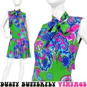 True vintage 60s scooter dress by Gay Gibson. F/ rad psychedelic print, mini-pleated skirt & pussy bow. Deadstock condition!