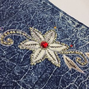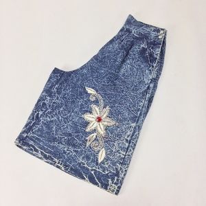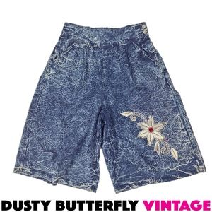 Super trendy vtg 80s embellished culottes in acid wash chambray. Wear 'em w cowboy boots or retro platforms <3!
