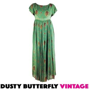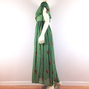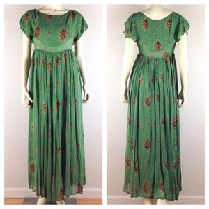 Vintage 90s boho style formal / semi-formal voile dress in muted mint green w/ floral pattern in pink, green, yellow, brown & off-white. GORGEOUS!!