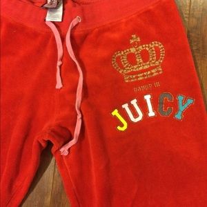 A must have Juicy track suit that has been used a bunch of times but has lots of life left! It's a size LARGE but fits like a medium. Definitely a fun Red track suit!