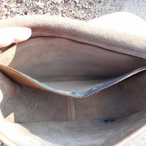 This Classic Shoulder Bag is in the color Putty, with a lovely patina. This girl has some ink stains, but she is still a pretty bag.