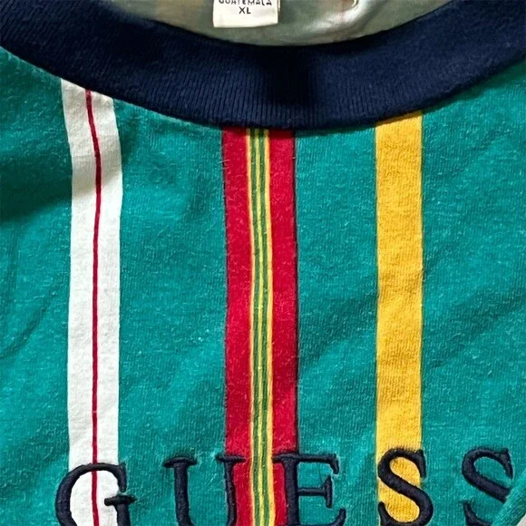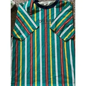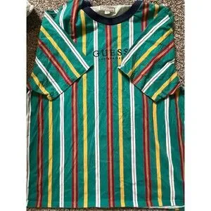 Vintage GUESS Los Angeles Originals men’s T-shirt in size XL regular fit. Green cotton knit with vertical yellow/red/white stripes and an embroidered GUESS Los Angeles chest logo. Crew neck and short sleeves. Made in Guatemala. Suitable for casual wear, streetwear outfits, and everyday outings. Condition: Pre-owned.