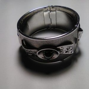Whiting & Davis Silver & Hematite Gemstones Hinged Cuff Bangle Bracelet comes with a secure safety closure. It has 3 Hematite gemstones that are displayed with flawless silver detailed filigree components. It's in excellent pre-owned condition. This is a Vintage bracelet from the 70's. Would look great with any style outfit. Make it yours today. All reasonable offers considered, no lowballing please. Please view all photos for your reference before purchasing. Any questions, contact me. Thank you.