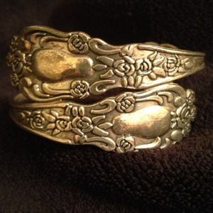 Designed with old fashioned spoon handles, this silver bracelet is quite comfortable. It has a little bit of wear, but that just adds to the vintage look. It's not very easy to put on, but it feels nice against the skin once you're wearing it.