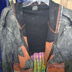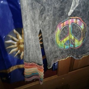 **SOLD**PREOWNED BY ME SHOP THERAPY JACKET FEATURES FRONT ZIPPER 2 SIDE POCKETS POINTED HOODIE - SO COOL. COLORFUL LARGE PEACE SIGN ON BACK A LITTLE FLAIR AT BOTTOM OF ARMS. IN THE 3RD PIC I TRIED TO CAPTURE THE ONLY FLAW AT BOTTOM OF JACKET TO LEFT OF ZIPPER ABOUT 6 STITCHES HAVE COME OUT I THINK I BOUGHT LIKE THIS. I ONLY WORE 2 TIMES. EASY TO HAVE PUT BACK IN. DOES NOT MAKE HEM HANG..DOES NOT AFFECT THE.JACKETS APPEARANCE.