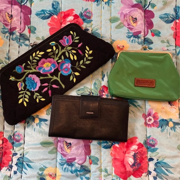 This bundle includes a Vera Bradley clutch (black), a Fossil leather wallet and a green nylon Dooney kisslock wallet.