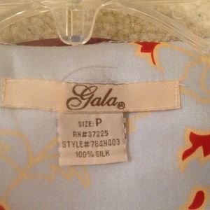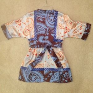 Kimono style top with tie in back. Barely worn, 100% silk, attractive color scheme and shapings. By Gala. Beautiful shirt really and so soft against the skin :)
