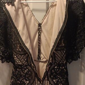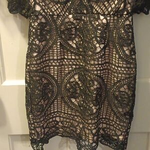 Super cute black crocheted short sleeve dress. It has a light peach colored attached dress underneath. Zips up the back. V neck. Short sleeved, bat wing sleeves. From Soleblu in a size small.