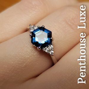 SOLID 925 Sterling Silver London Blue Topaz Hexagon White Topaz Ring