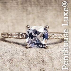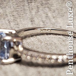 Cushion cut sky blue topaz with brilliant cut cubic zirconia accents. The band and settings are crafted from solid 925 sterling silver and engraved "S925". Guaranteed 100% genuine!! All photos show actual rings for sale and are property of Penthouse Luxe Jewelry.