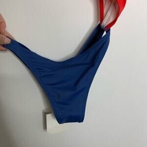 Jourdan style. Swim team collection. Two tone red and blue. Cut out one piece monokini. High cut legs. Polyamide elastane blend. Hand wash.