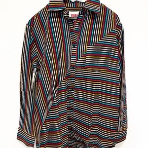 This rainbow pinstripe tunic features a classic spread collar, chest pocket, and button cuffs for a timeless yet trendy look.