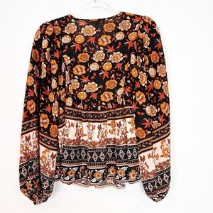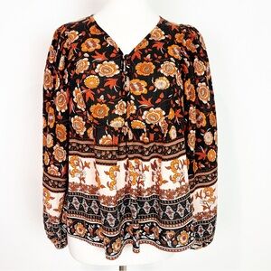 Solitaire orange black tan floral pattern long sleeve boho blouse.