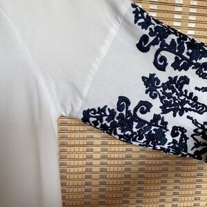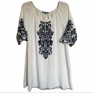 Solitaire Swim raglan crew neck white with navy blue embroidery cover up tunic.