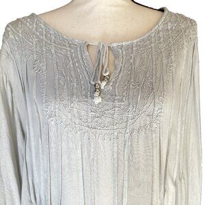 Solitaire light grey 100% rayon Boho light gray tunic top with tasseled tie neckline. Embellished with pleats and embroidery.