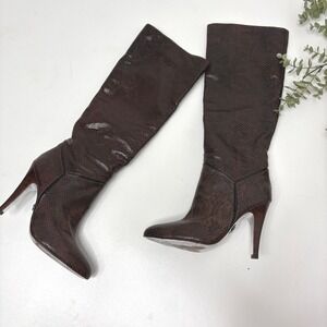 Keywords: snakeskin boots, stiletto heels, knee high, brown boots, fashion boots, dress boots, evening wear, statement boots, designer inspired, luxury footwear, pointed toe, side zip, elegant