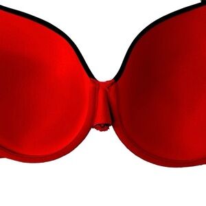 This elegant bra features a seamless black design with a striking red trim, offering both style and support. The molded cups provide a smooth silhouette, while the elastic straps ensure a comfortable fit. Perfect for adding a touch of sophistication to your intimate collection.