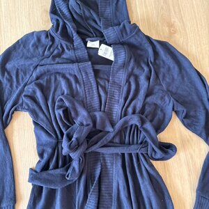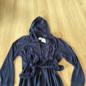 New with tags! Beautiful navy blue brushed soft cozy wrap with a hood, pockets, and tie belt.