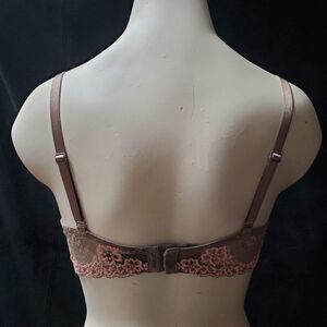 Very good pre-owned condition. Underwire bra, taupe with pale pink lace trim.