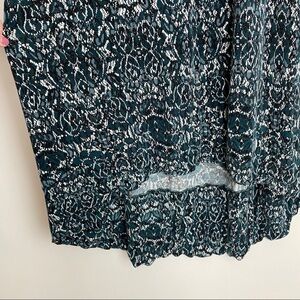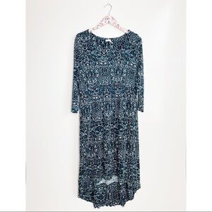 Soma woman’s hi-low hem dress! Round neck line, long sleeves, super soft stretchy knit. Elastic empire waist. Teal green-blue color with black & white, in kind of a lace looking pattern. ‼️No size, I’m thinking it’s a medium.