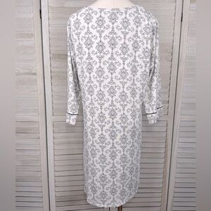 Gently used and in great condition. Women's 3/4 sleeve sleep dress/nightgown. Pale gray with black pattern and black piping on sleeves.