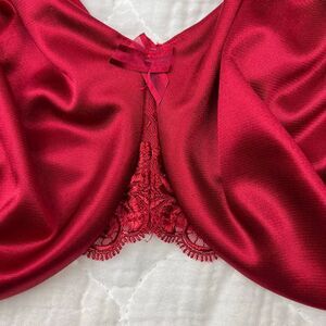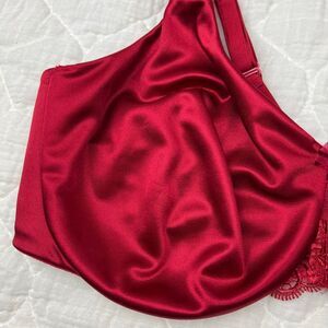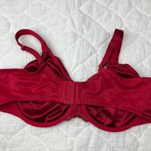 Keywords: minimizer bra, red bra, women's lingerie, adjustable straps, underwired bra, lace detail, supportive bra, 42D bra, comfortable bra, special occasion bra, everyday wear, pre-owned bra, hook and eye closure, decorative bow.