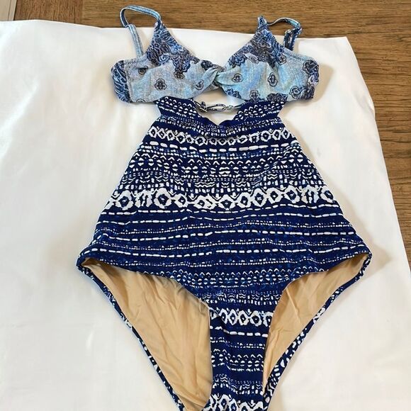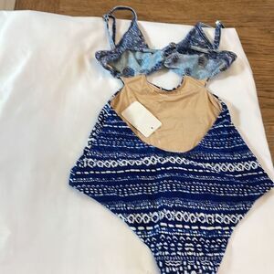 SOME DAYS ONE PIECE SHADES OF BLUE AND WHITE ONE PIECE BATHING SUIT. HIGH WAISTED. NEW W TAGS