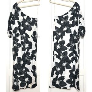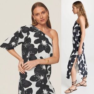 SOMETHING NAVY Floral Print Linen Cotton One Shoulder Puff Sleeve Column Gown L