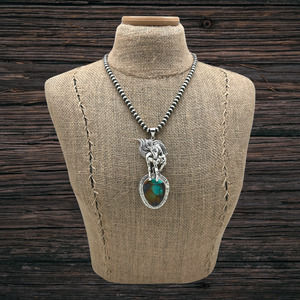 Make a bold statement with this stunning sterling silver pendant by Som's International, skillfully crafted in Bali. The focal point is a captivating piece of Hubei turquoise, bezel-set with an intricate fancy scroll border, creating a harmonious blend of elegance and artistry. Atop the setting, a prancing horse captures attention, displaying remarkable motion with its flowing mane and tail. The back of the horse bears a plaque with the copyright "925 SOM'S TM," ensuring the authenticity of this unique piece. With a total length, including the bail, of 4.125", a width at the widest point of 1.5", and a substantial weight of 54 grams, this statement pendant is a testament to the craftsmanship and creativity of Som's International.
