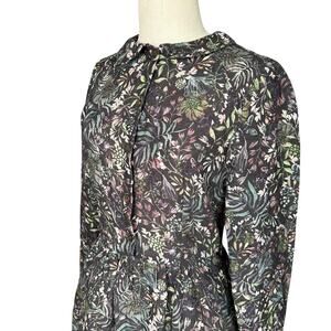 Features side zip closure, colorful whimsy floral pattern, long sleeves, button front, pockets, collared.