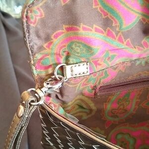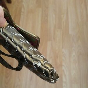 Sondra Roberts gold / taupe metallic basket weave clutch.
