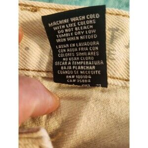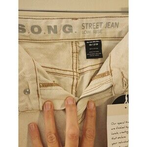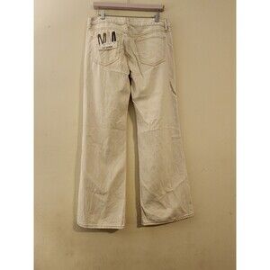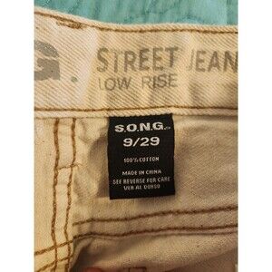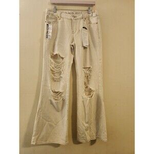 These are SONG brand white denim jeans for juniors, featuring a low rise and a flared wide leg style. They have a distressed look with a 5-pocket design and a zipper closure. The jeans are made of cotton material with a waist size of 32 inches and an inseam of 31 inches. The design is inspired by rock, music, and hip hop themes, making them a stylish choice for all seasons.