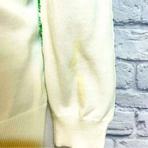 Green and cream print print front with pink and black details. Slightly Cropped Style, Used condition, there is a stain on the back of the right arm as well as on the inside, I’ve detailed the wear on the pics. Shorter in the front, longer in the back.