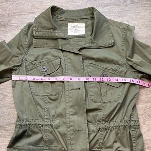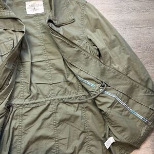 DESCRIPTION: Army green utility goat. Front pockets. Button up & zipper closure. Drawstring at waist.