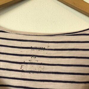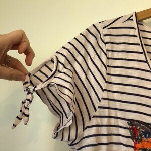 Off white - almost like a cream ish pink ish / navy blue horizontal stripe multi / multicolor tee t-shirt. Pink / brown / orange / blue multicolor partially embroidered butterfly embroidery detail. Short sleeve. Cutout and tie sleeve detail. Scoop ish neck. Spring summer casual weekend comfy cozy