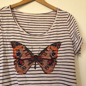 SONOMA Cream ish Navy Stripe Embroidered Butterfly Tee T-Shirt PETITE Small PS