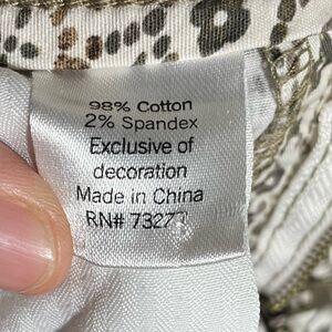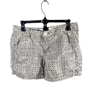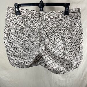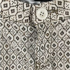 Women Size 6. Sonoma Good for Life. Earth tone all over pattern shorts. Stretchy. 98% cotton 2% spandex. White with a fun and flirty all over pattern (shades of green, gray, olive, tan, beige, brown). cuffed hemline. Front diagonal pockets & faux back pockets. Button zip closure.