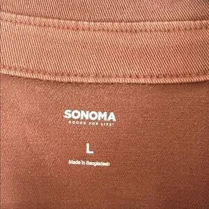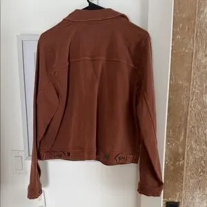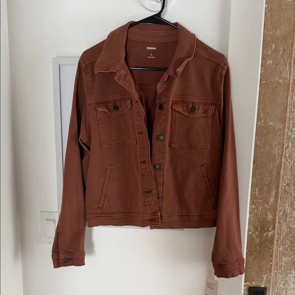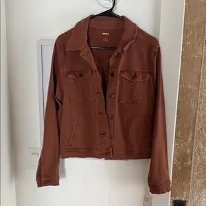 Classic denim jacket with button-front closure. Dual chest pockets and side welt pockets. Soft, structured fabric, warm rust-brown shade.