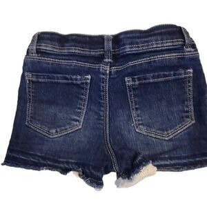 Jean shorts are timeless and essential to a little girl's wardrobe. This cottagecore pair is your quintessential jean short made feminine by a sweet row of white eyelet lace peeking out on each leg. White topstitching. They are perfect activewear, just as at home at a party as they are on the beach or a gorpcore outing. A nicely faded blue jeans short in a 5-pocket style and front zipper. Permanent crease marks add to the nicely "broken in" look of these cutoffs.