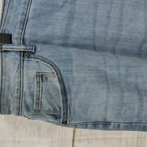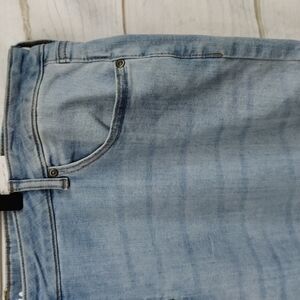 Relaxed through hip and thigh wide leg opening, frayed hem, light to medium wash, good stretch for comfort.