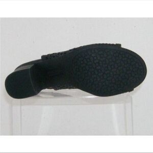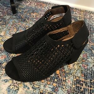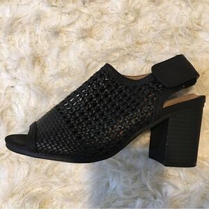 Excellent Condition ( no ware to soles) Size 6 Black woven Peep toe Cushioned Heel 3 Velcro adjustable sling backs