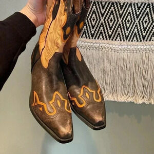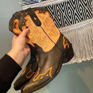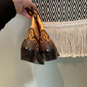 Size 7.5! Sonora by Double H vintage orange flame cowgirl boots. Comfortable and broken in. See wear in photos mainly on back of heel. Perfect statement boots with a skirt, jeans, or a cute dress! Excellent used condition. Reasonable offers welcome!