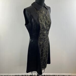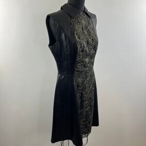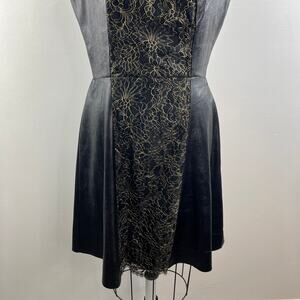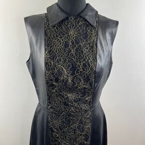 SOPHIA KAH Black & Gold Lambskin Leather & Lace Panel Sleeveless Sheath Dress