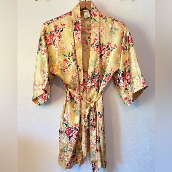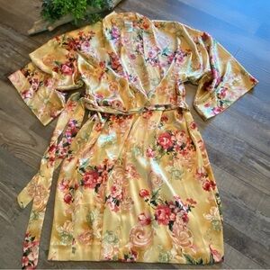 SOPHIA by DELICATES Silky Gold Robe with Floral Rose Print and Tie Belt, Medium