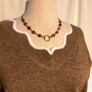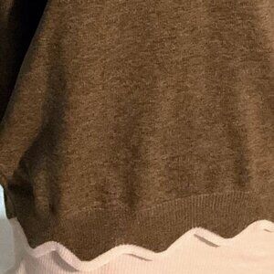 Soft and sensual, natural colored wool sweater with a whimsical cream rick-rack style neck, wrist and bottom detail. Label says 2X, but it is more of an XL. It was snug on me at 185 lbs. very feminine and practical. Not heavy or itchy, can be worn alone or with a cami.
