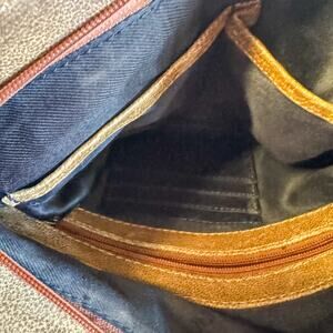 The silhouette is a practical, small-to-midsize crossbody/shoulder bag with a unique curved top and a magnetic flap closure. The strap is long, adjustable, and made of the same textured brown leather. This is an excellent statement accessory for those who appreciate folk art, bohemian style, or unique leather goods. The interior features multiple pockets for organization, including a zippered section.