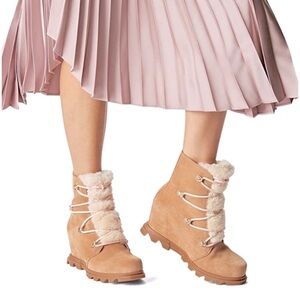 SOREL $250 Joan Arctic Shearling Nubuck Leather Wedge III Booties Size 10.5 NEW